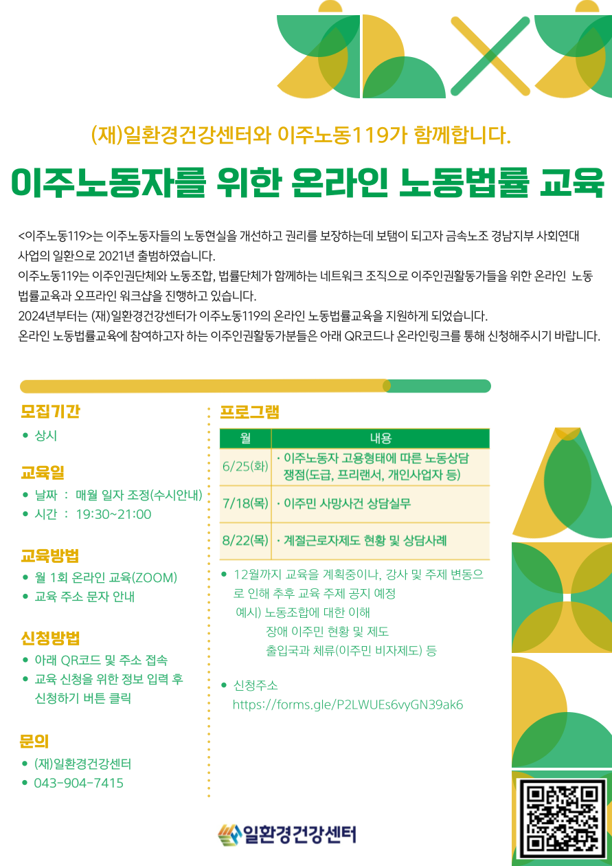 (Àç)ÀÏȯ°æ°Ç°­¼¾ÅÍ¿Í ÀÌÁֳ뵿119°¡ ÇÔ²² ÀÌÁֳ뵿ÀÚ¸¦ À§ÇÑ ¿Â¶óÀÎ ³ëµ¿¹ý·ü ±³À°À» ½Ç½ÃÇÏ°Ô µÇ¾ú½À´Ï´Ù.