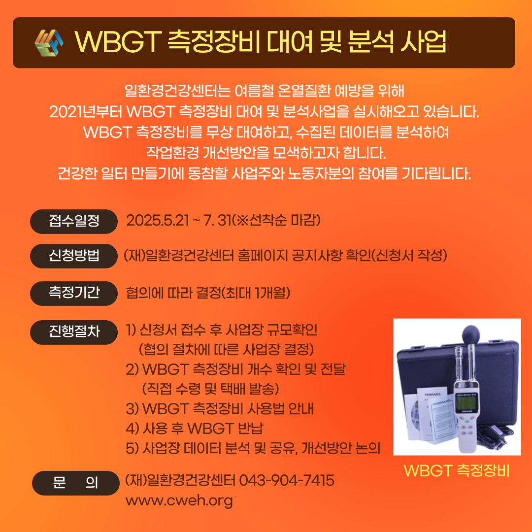 Àç´Ü¹ýÀÎ ÀÏȯ°æ°Ç°­¼¾ÅͰ¡ ¿©¸§Ã¶ ¿Â¿­Áúȯ ¿¹¹æÀ» À§ÇØ¡¸WBGT(½À±¸È汸¿ÂµµÁö¼ö) ÃøÁ¤ Àåºñ ´ë¿© ¹× ºÐ¼®»ç¾÷¡¹À» ÁøÇàÇÕ´Ï´Ù.