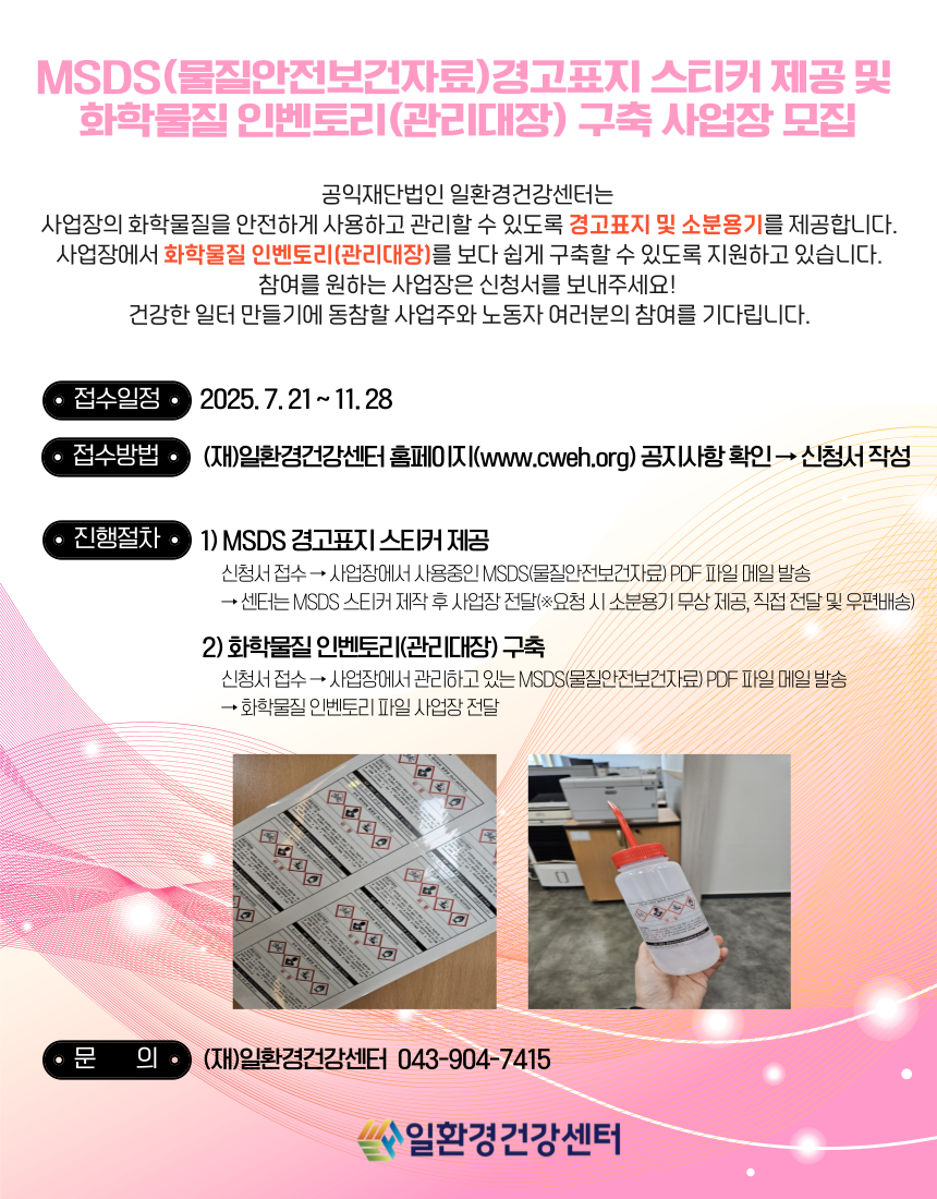 »ç¾÷ÀåÀÇ È­Çй°ÁúÀ» ¾ÈÀüÇÏ°Ô »ç¿ëÇÏ°í °ü¸®ÇÒ ¼ö ÀÖµµ·Ï MSDS(¹°Áú¾ÈÀüº¸°ÇÀÚ·á)°æ°íÇ¥Áö ¹× ¼ÒºÐ¿ë±â¸¦ Á¦°øÇϰí ÀÖ½À´Ï´Ù.