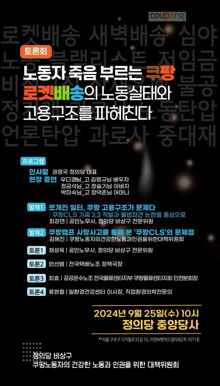 2024³â 9¿ù 25ÀÏ '³ëµ¿ÀÚ Á×À½ ºÎ¸£´Â ÄíÆÎ ·ÎÄϹè¼ÛÀÇ ³ëµ¿½ÇÅÂ¿Í °í¿ë±¸Á¶¸¦ ÆÄÇìÄ£´Ù' Åä·ÐȸÁß ÀÚ·áÁýÀ» ¹èÆ÷ÇÕ´Ï´Ù.