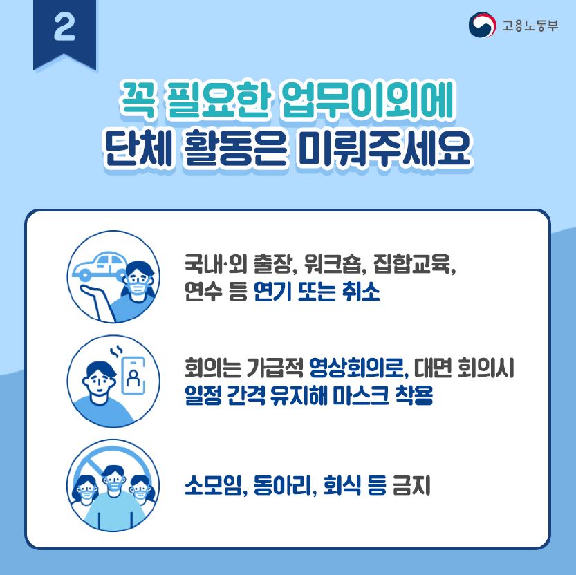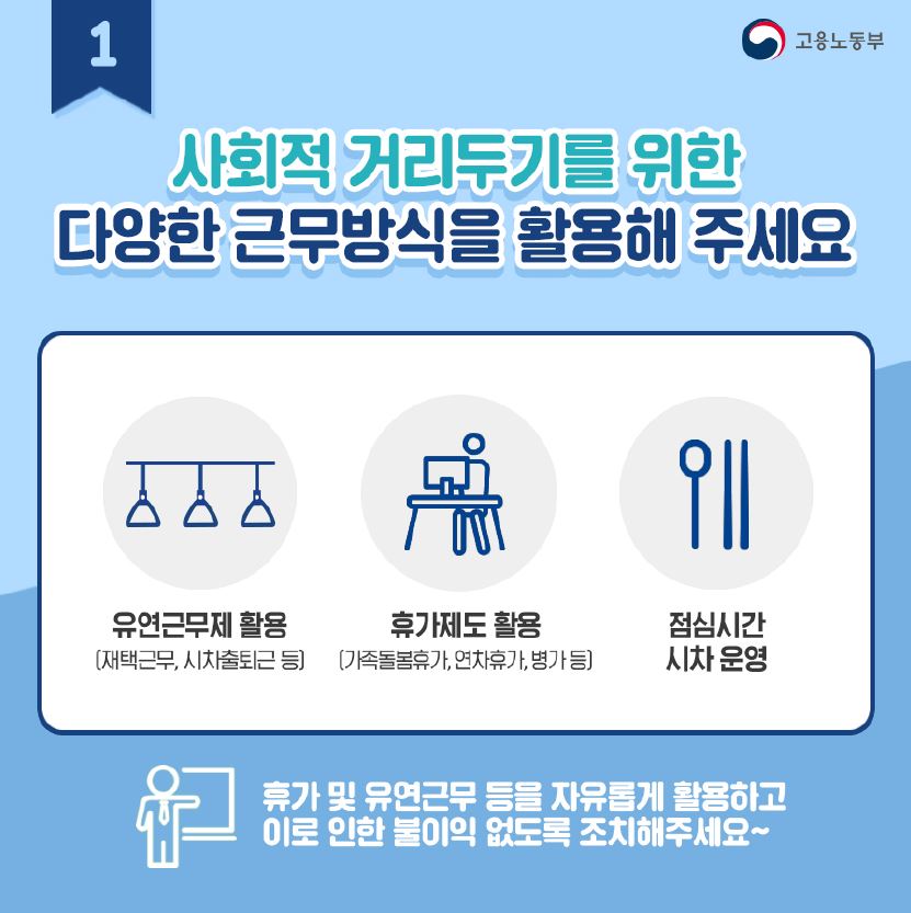 °í¿ë³ëµ¿ºÎ¿¡¼´Â »çȸÀû °Å¸®µÎ±â »ç¾÷Àå ÁöħÀ» ¸¶·ÃÇÏ¿© ¹èÆ÷ÇÏ¿´½À´Ï´Ù. ÁÖ¿ä³»¿ëÀº ´ÙÀ½°ú °°½À´Ï´Ù. - ÀçÅá¤À¯¿¬±Ù¹«, ÈÞ°¡Á¦µµ Ȱ¿ë ¹× ±¹³»¿Ü ÃâÀå, ´ë¸éȸÀÇ, ÁýÇÕ±³À°¿¬±â ¶Ç´Â Ãë¼Ò - À¯Áõ»óÀÚ´Â ¿¬Â÷ÈÞ°¡¡¤º´°¡ Ȱ¿ëÇÏ¿© Ãâ±ÙÇÏÁö ¾Ê±â, ±Ù¹« Áß Áõ»ó ¹ßÇö ½Ã Áï½Ã Åð±Ù Á¶Ä¡ µî Âü°íÇϼż »çȸÀû °Å¸®µÎ±â ±â°£(3¿ù23ÀÏ~4¿ù5ÀÏ) µ¿¾È Âü°íÇϽñ⠹ٶø´Ï´Ù.